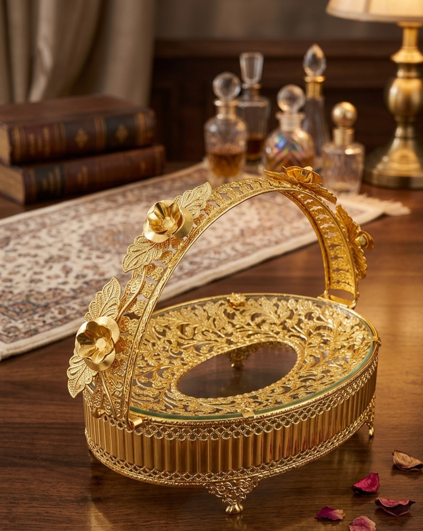 اجعلي ضيافتك تتحدث عن ذوقك الرفيع مع هذه السلة الاستثنائية. قطعة فنية صُممت لتكون قلب الطاولة في حفلات الاستقبال والزيارات الخاصة، حيث تبرز جمال ما تقدمينه من حلويات، تمور، أو فواكه مجففة.