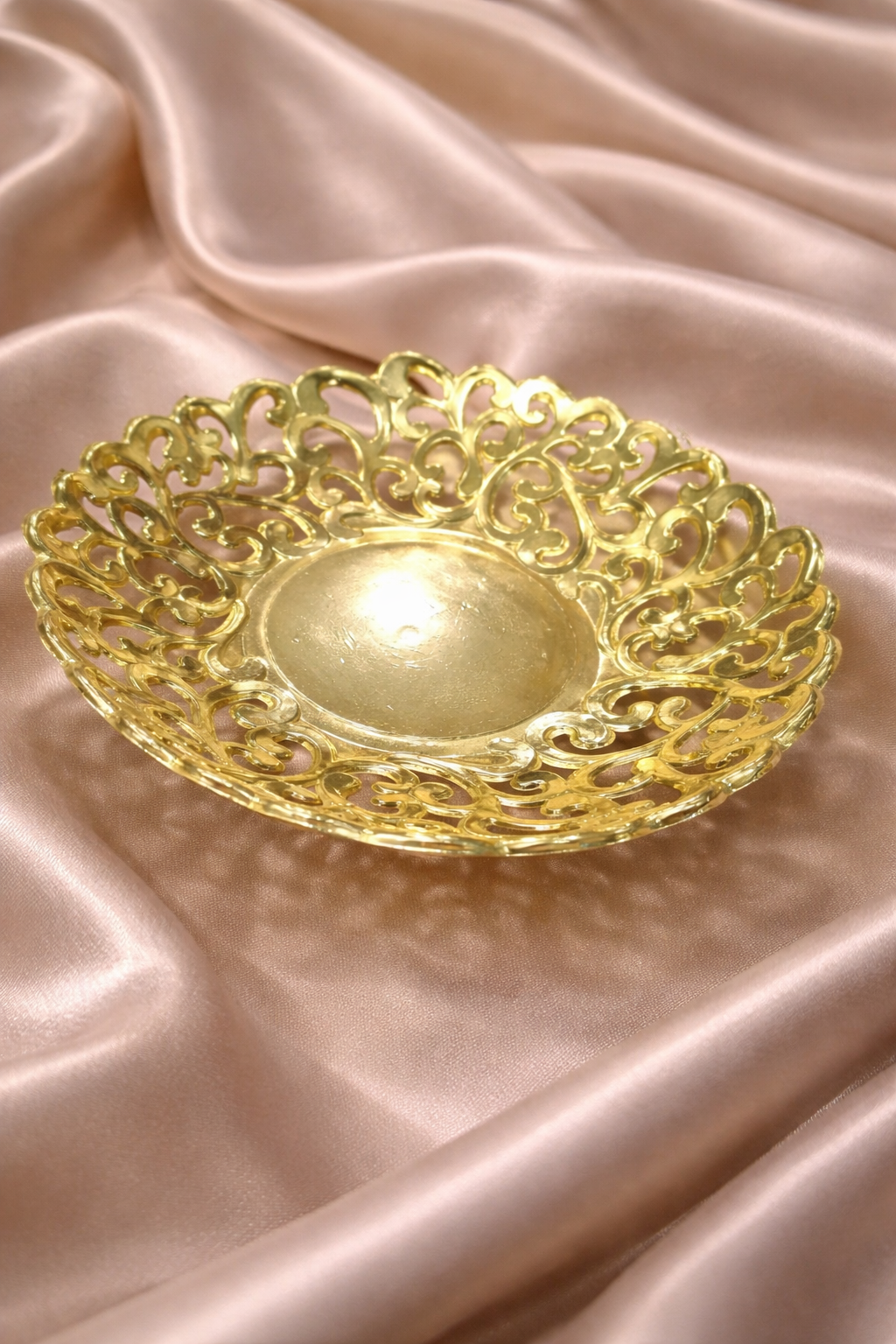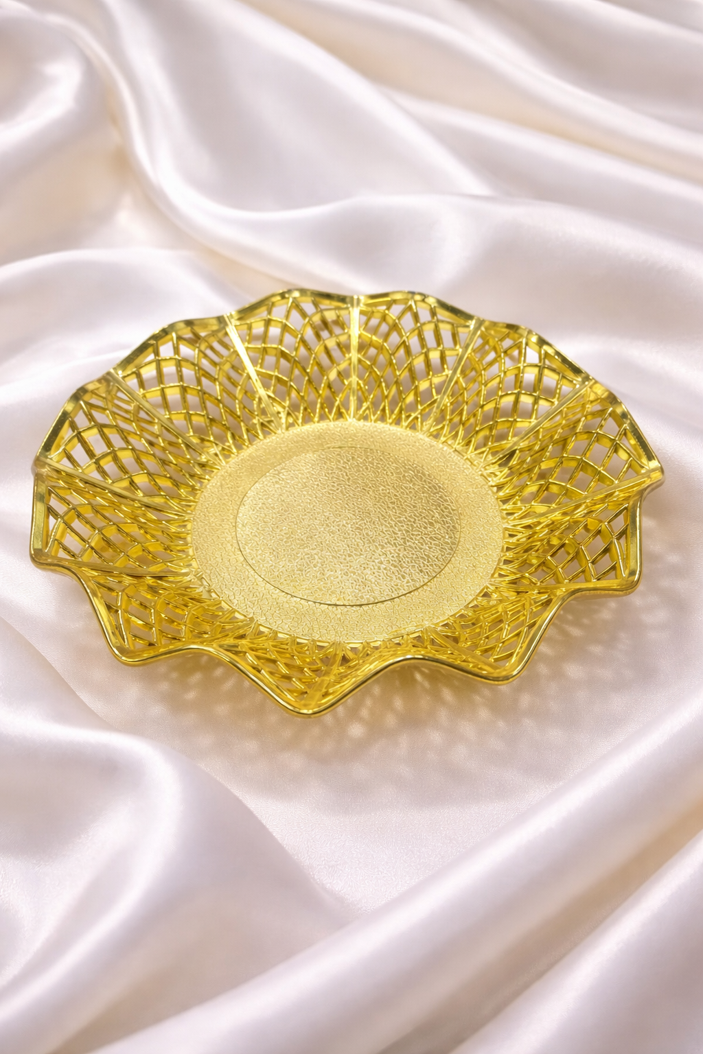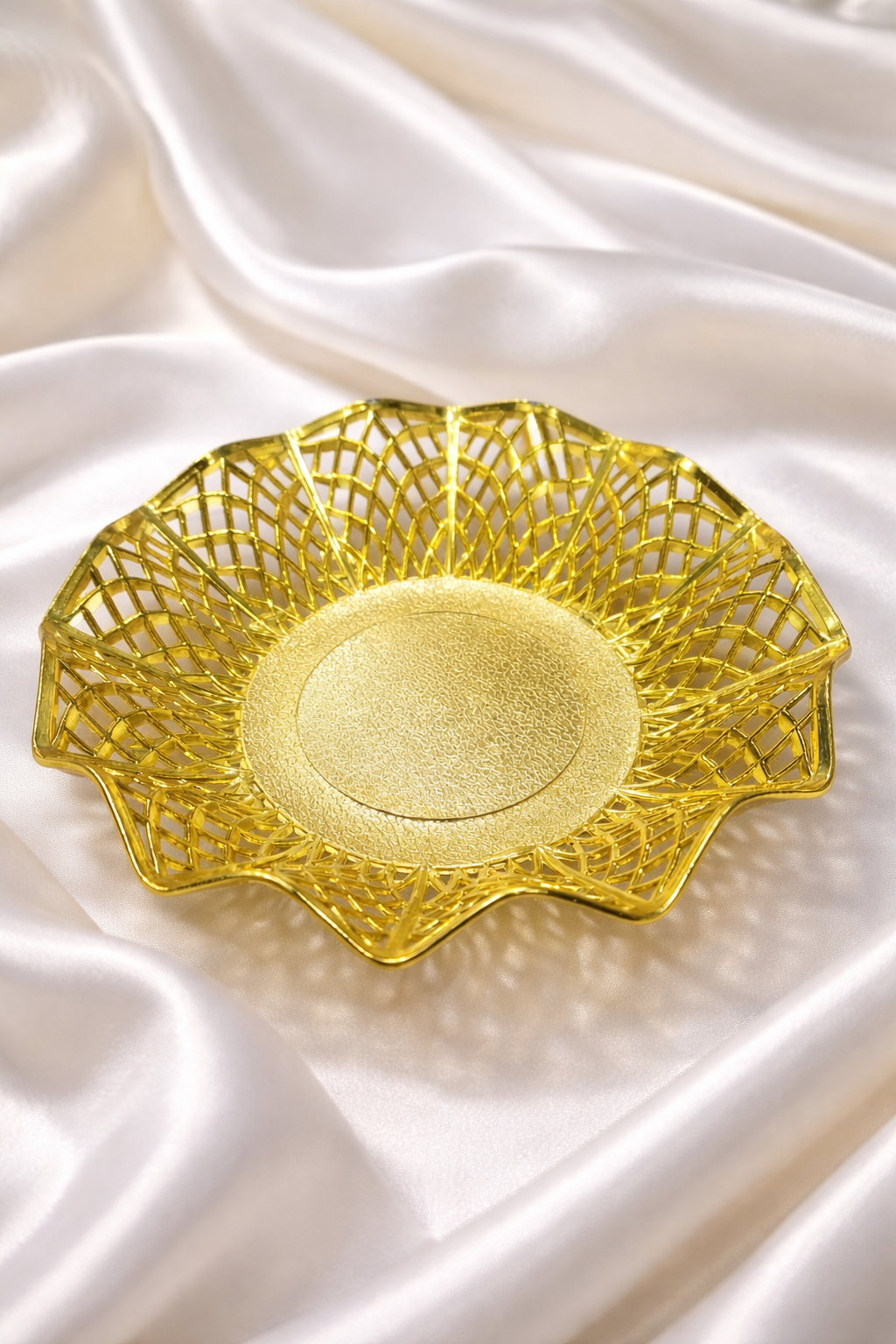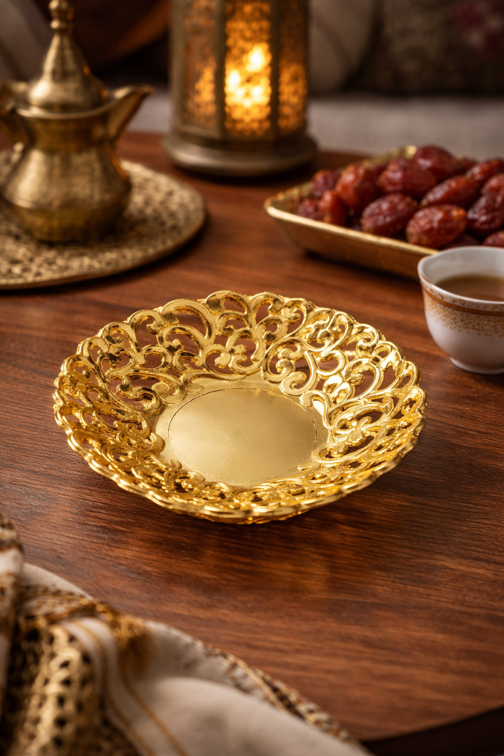 أضيفي بريقاً من الفخامة إلى مائدتك مع صحن التقديم الذهبي المصمم بنقوش “أرابيسك” مفرغة غاية في الدقة والجمال. قطعة فنية تجمع بين التراث العريق والتصميم العصري، لتجعل من تقديم الضيافة تجربة استثنائية لا تُنسى.