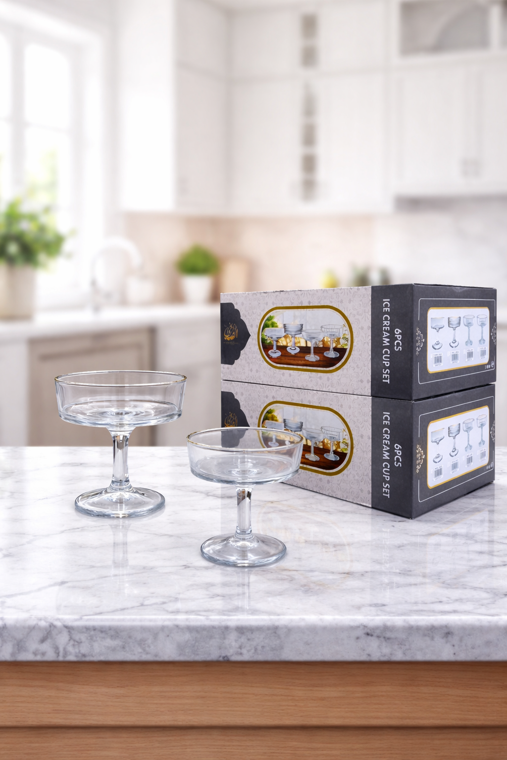 حوّلي كل لحظة تحلية إلى تجربة فندقية فاخرة في منزلك مع طقم أكواب الآيس كريم والحلويات (6 قطع). بتصميمه الزجاجي المذهب والراقي، هذا الطقم ليس مجرد أوانٍ للتقديم، بل هو قطعة فنية تُزين مائدتك وتُبهر ضيوفك.