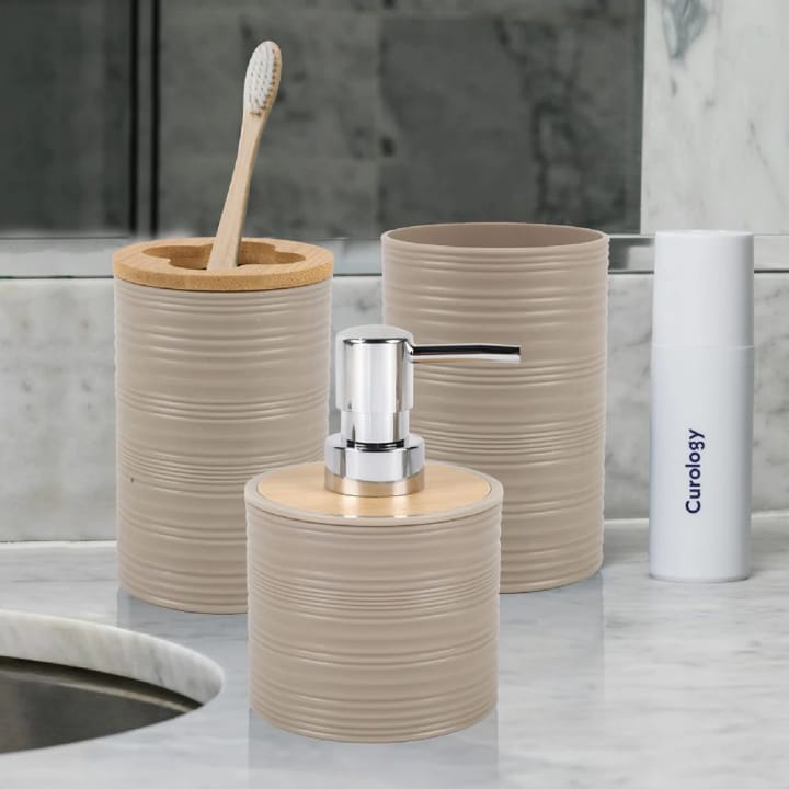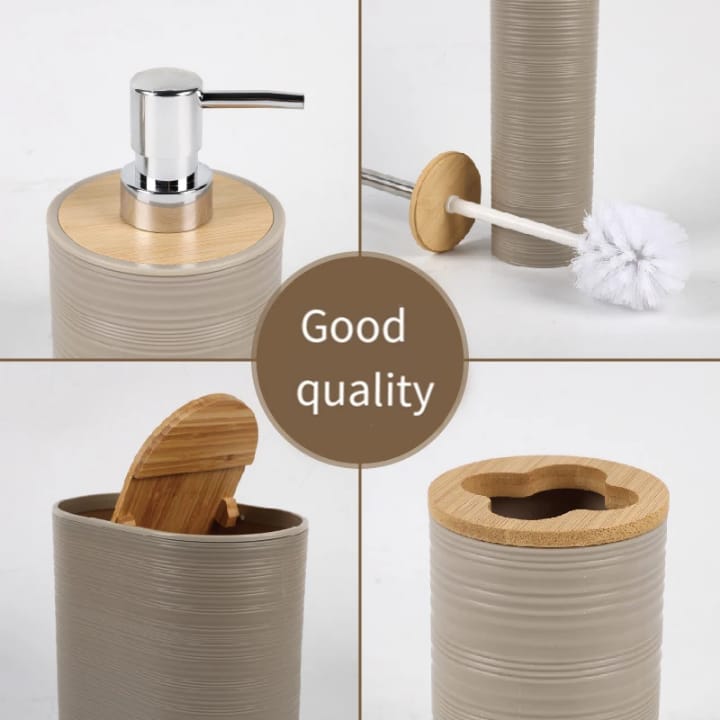 حوّل حمامك إلى ملاذ من الاسترخاء والأناقة مع هذه المجموعة الفاخرة المكونة من 6 قطع متكاملة. بفضل تصميمها الذي يمزج بين اللمسات الخشبية الدافئة واللون الرمادي الهادئ، تمنحك هذه المجموعة توازناً مثالياً بين الطابع المودرن واللمسة الطبيعية