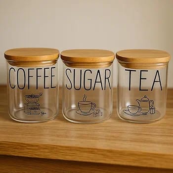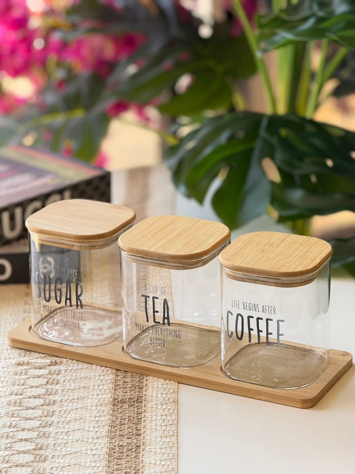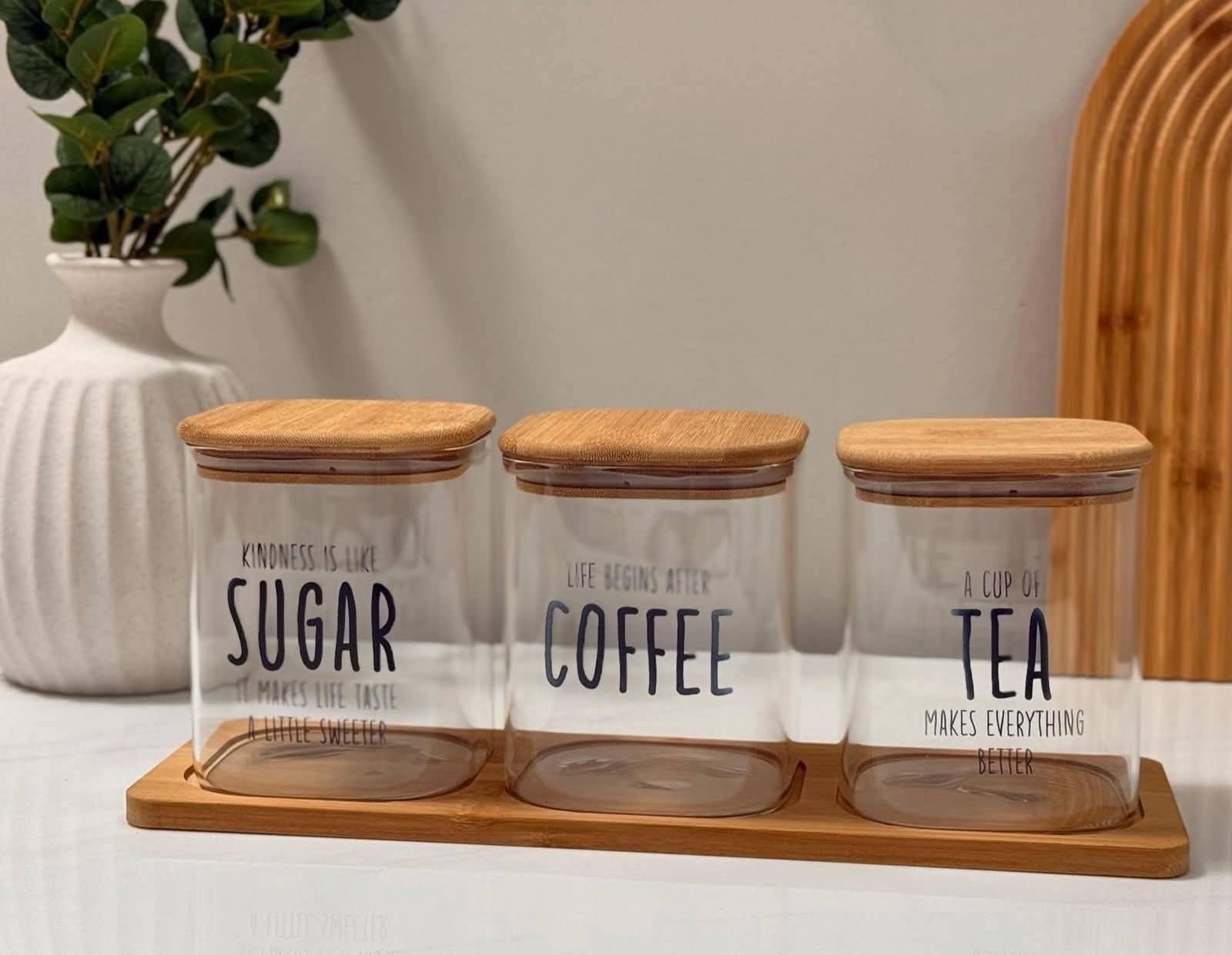 استمتع بمزيج من المتانة والأناقة مع هذا الطقم المصمم خصيصاً لمحبي التنظيم. العلب مصنوعة من الزجاج المقاوم والآمن غذائياً، وتأتي مع قاعدة خشبية بتجاويف مخصصة تضمن ثبات العلب وتنظيم سطح العمل.