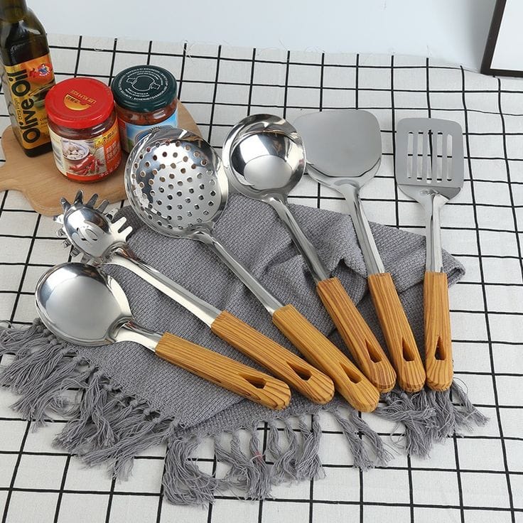 🍳 طقم أدوات المطبخ الاحترافي – مزيج السحر الخشبي ومتانة الستانلس ستيل!