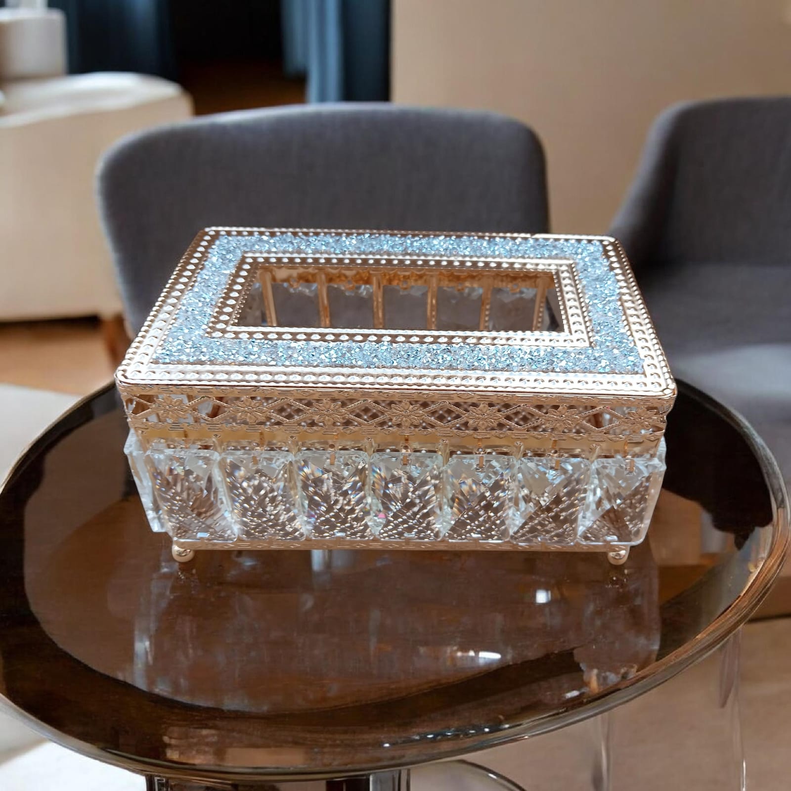 أضف لمسة من الرقي والجمال إلى طاولة الضيافة مع علبة المناديل الكريستالية الفاخرة. صُممت هذه القطعة بعناية فائقة لتكون أكثر من مجرد علبة مناديل، بل هي تحفة فنية تعكس ذوقك الرفيع.