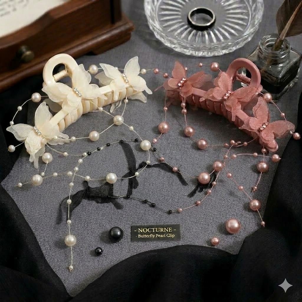 تصميم خيالي: فراشات من الشيفون الرقيق المزين بحبيبات اللؤلؤ والستراس اللامع، تمنحكِ مظهراً حيوياً وكأن الفراشات استقرت للتو على شعرك.