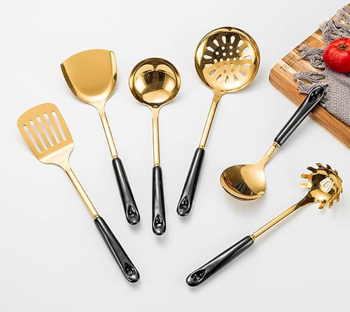 أداة طهي أنيقة بلمسة ذهبية فاخرة ومقبض أسود مريح ، تجمع بين المتانة وسهولة الاستخدام مثالية للطهي اليومي دون خدش أو تلف ، وتضيف لمسة عصرية راقية لمطبخك ، خيار عملي وجذاب لكل بيت .