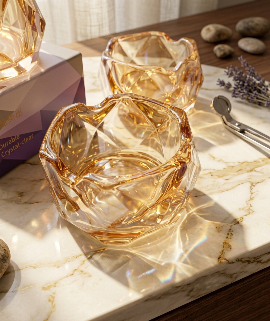 تصميم “دايموند” هندسي: تتميز بتضليعات كريستالية دقيقة تعكس الضوء بجمالية عالية، مما يجعلها تبدو كقطعة ديكور ثمينة وليست مجرد طفاية.